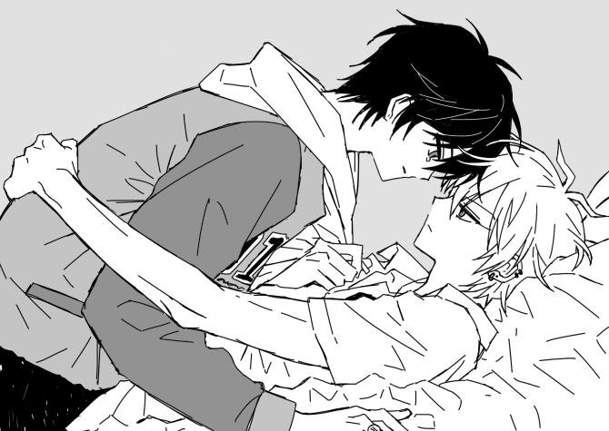 질색하는 얼굴로 밀어내던 손이 다시금 시트를 짚었다. 이치로가 아래를 쥐고 흔든 탓이다. 선단에서 흐른 프리컴을 손바닥에 덧발라 느슨하게 문지르는 감각에 쾌감이 등줄기를 내달린다. 문득 아오히츠기 사마토키는 스스로 한 지도 오래되었음을 깨닫는다. 그럴 여유도 시간도 없었으므로. 그래서 평소보다 더 빨리 달아오른 거다. 그게 아니면 이렇게 빠른 사정이, 설명이 되지 않았다. 야마다 이치로가 눈을 껌뻑였다. 빠르네, 하고 중얼거리는 목소리가 여상했다. 달리기라도 한 것처럼 밭은 숨을 내쉬던 사마토키가 이를 갈다 몸을 일으켰다. 정확히는, 일으키려고 시도했다. 그대로 곧은 몸을 밀어 넘어트린 이치로가 후드를 단숨에 벗어 바닥 어드메로 팽개쳤다.